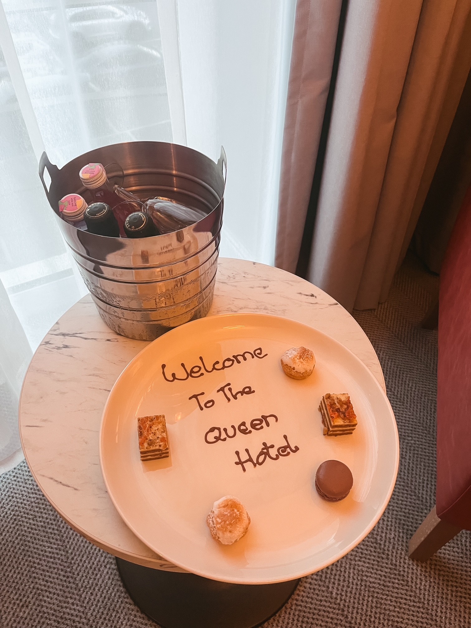 The room we were allocated was on the first floor and the hotel contains a beautiful sweeping staircase (pictured below) or a lift. We were treated with this sweet little dessert plate (everything was delish!) and some drinks to welcome us on the first night, which was a lovely touch.